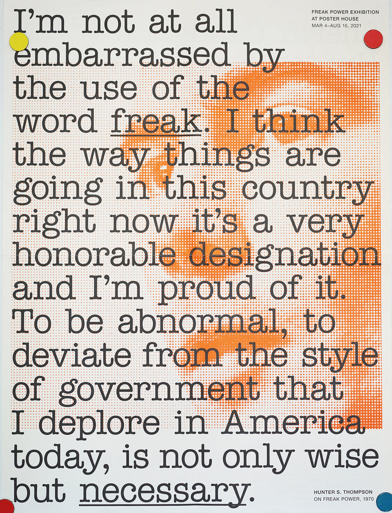 This 2-sided poster was produced by Poster House to promote their exhibition of poster art from Hunter S. Thompson's "Freak" political party. This poster measures 20"x27". From the museum's website....