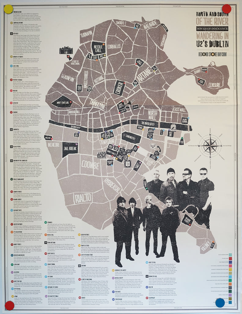 This U2 poster is titled "North and South Of The River - Wandering in U2's Dublin".  It was produced in 2014 as a promotion for Ireland's Record Store Day. This unique poster is a must have for any fan of U2 and or the city they call home. The poster measures 25" x 33". It was originally folded but will come rolled in a tube. All posters ship via USPS Priority Mail.