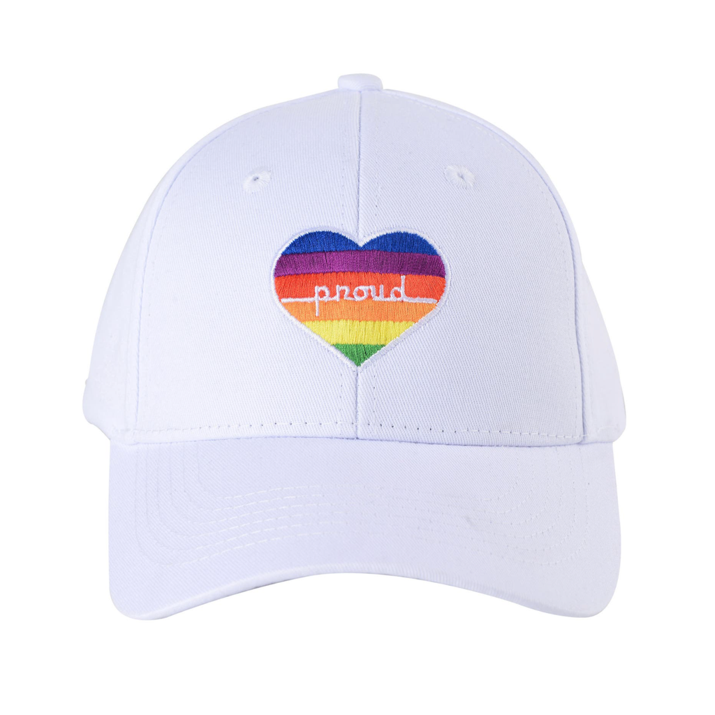 Celebrate diversity with this rainbow embroidered baseball cap. This white cotton cap features a rainbow colored heart with the word "Proud" embroidered in the center. It is the perfect way to stay cool and make a statement.