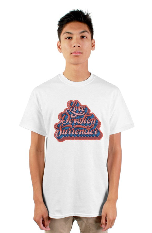 Love Devotion Surrender is an album released in 1973 by guitarists Carlos Santana and John McLaughlin, with the backing of their respective bands, Santana and The Mahavishnu Orchestra. The album was inspired by the teachings of Sri Chinmoy and intended as a tribute to John Coltrane. After three decades, Love Devotion Surrender still sounds completely radical and stunningly beautiful. Whether you know this album or simply agree with the title's sentiment, this beautifully designed typography makes for a great t-shirt.