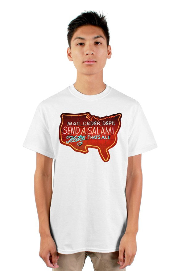 The neon sign, featured on this t-shirt, dates back to World War 2. The deli offered a service so that families could send Salami to their sons and daughters serving in the armed services. How classic is that!